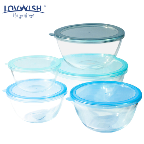 Very Popular 5pcs Hot Sale Round Home Decor Clear Heat Resistant With PP Lid Fruit Salad Food Kitchen Glass Bowl Cookware Sets